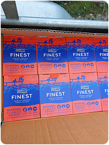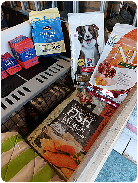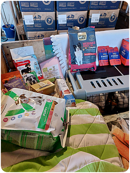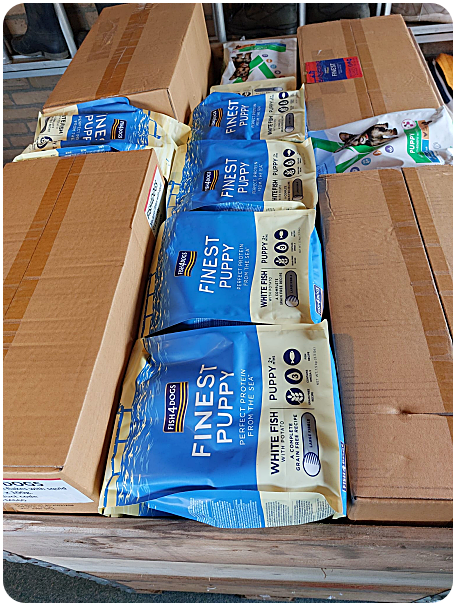 Honden-en kattenvoer (droog en nat), zakjes makreel snacks, dentasticks, kippenvoer, dekens, handdoeken en een autobench.