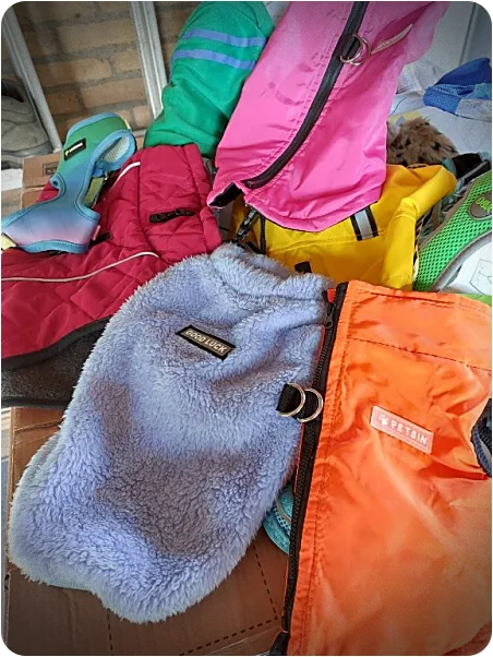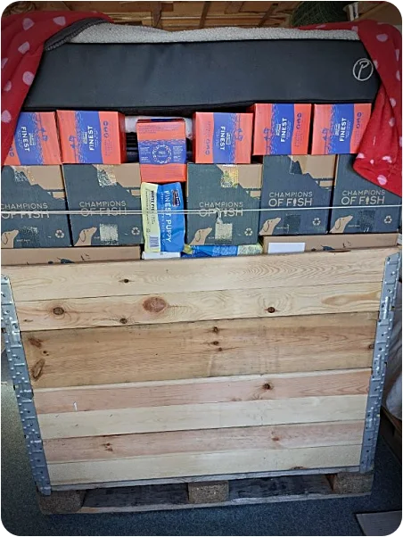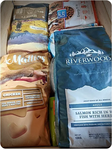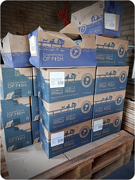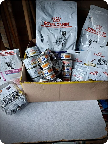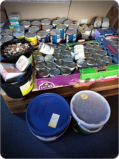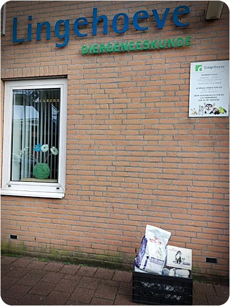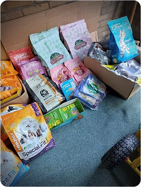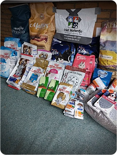 Honden, katten en puppy voer (zowel zakken als kuipjes/blikken), snacks, hondenjasjes, riemen/tuigjes, middelen tegen parasieten, dekentjes, badlakens, 2 benches en een groot orthopedisch kussen.